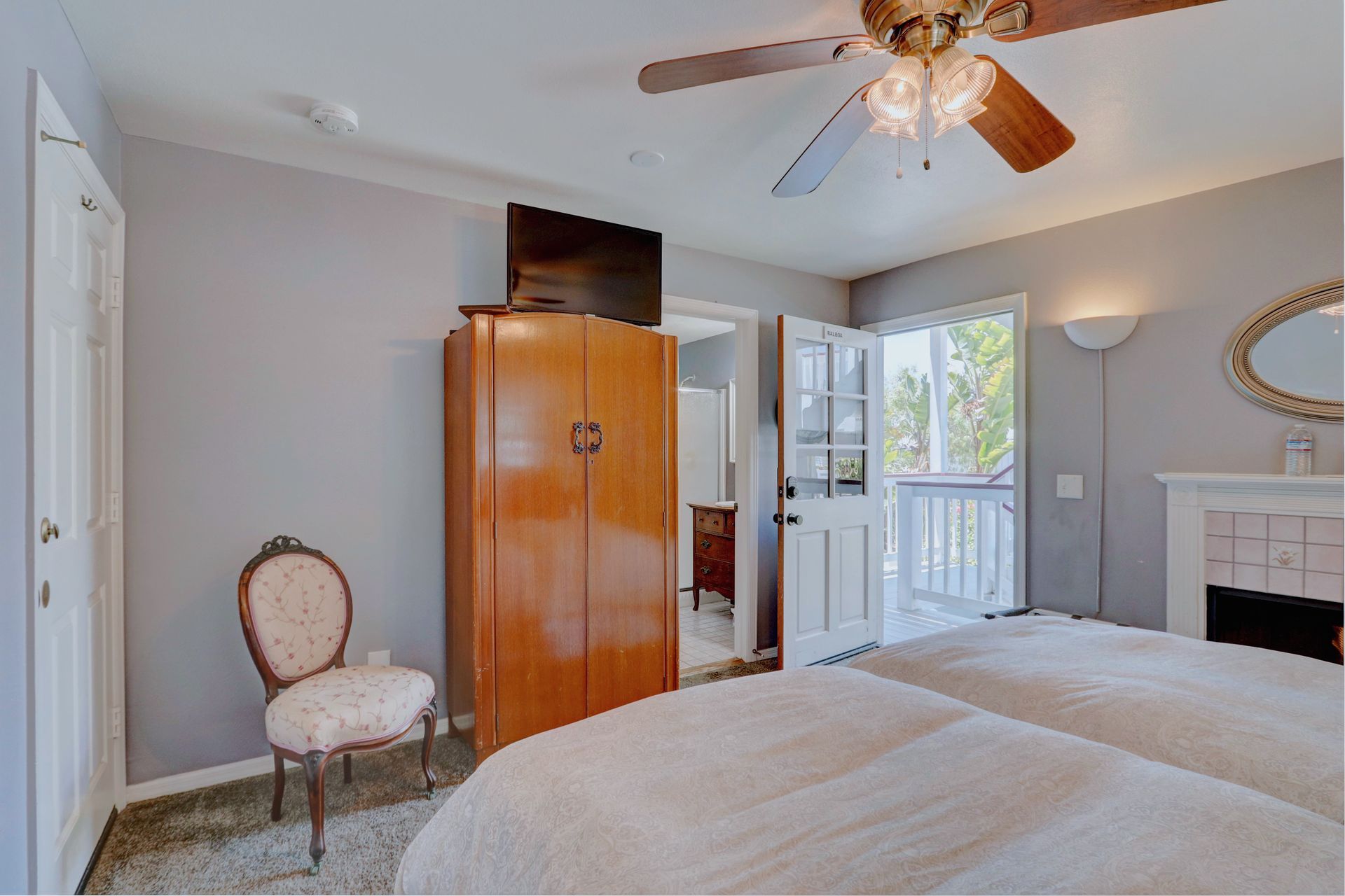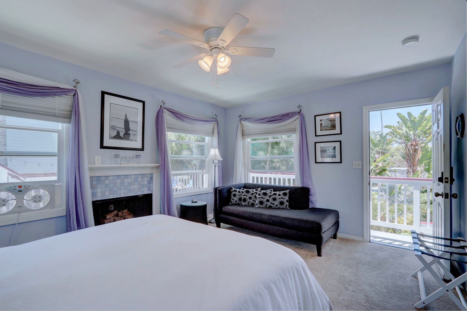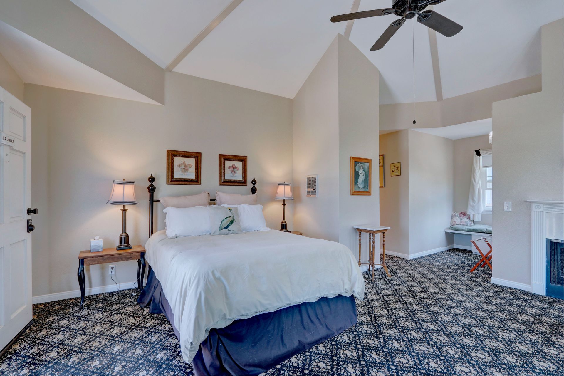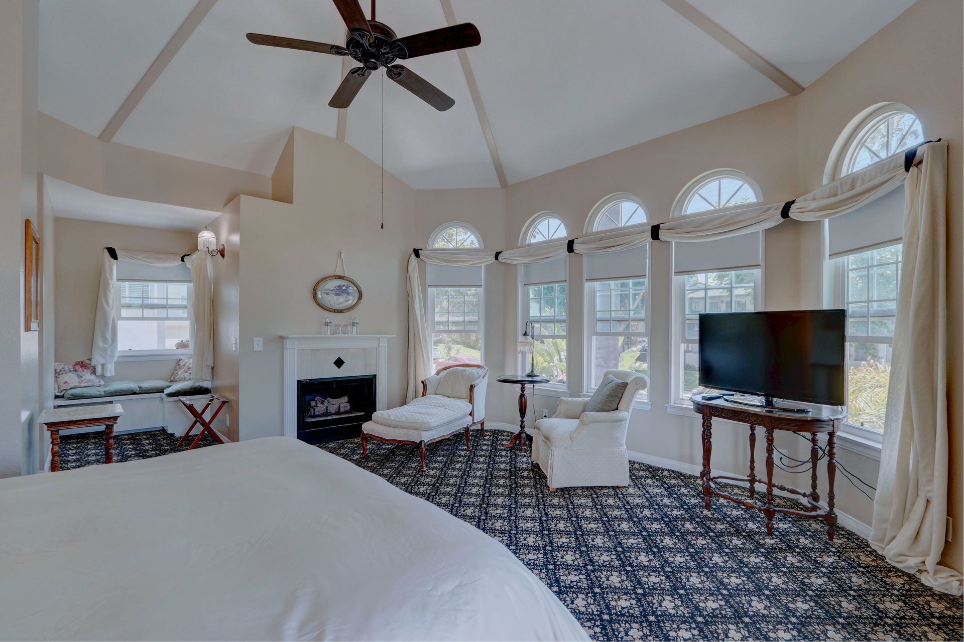 "The Jewel" of our rooms, this romantic room offers many comforts, including a large spa tub, queen bed, window seat and vanity. Windows surround all sides of this black and champagne room. This room can internally adjoin to the Del Mar. Smart TV.