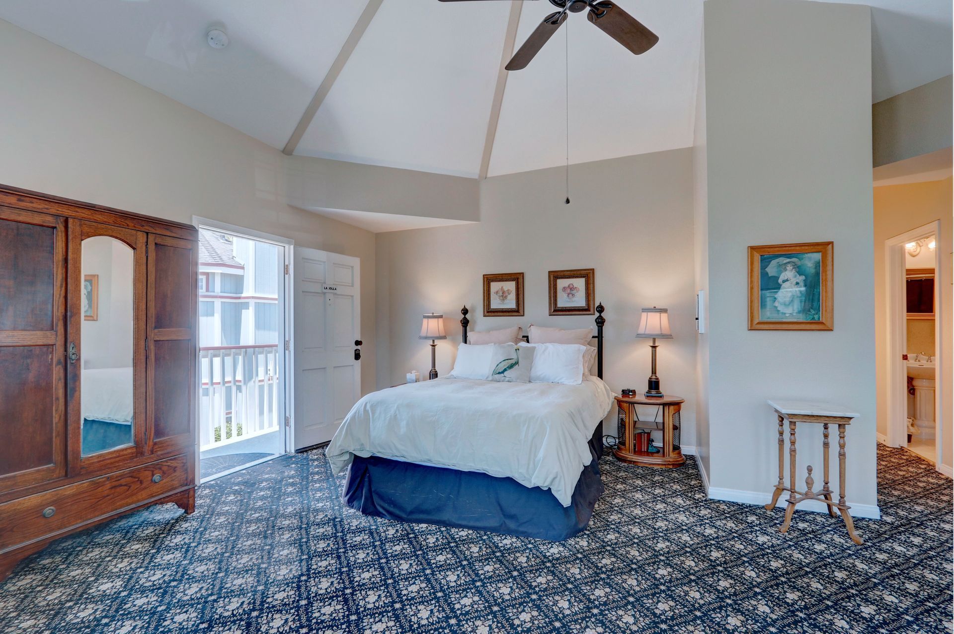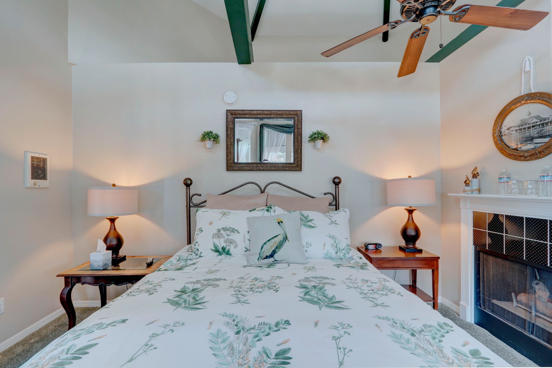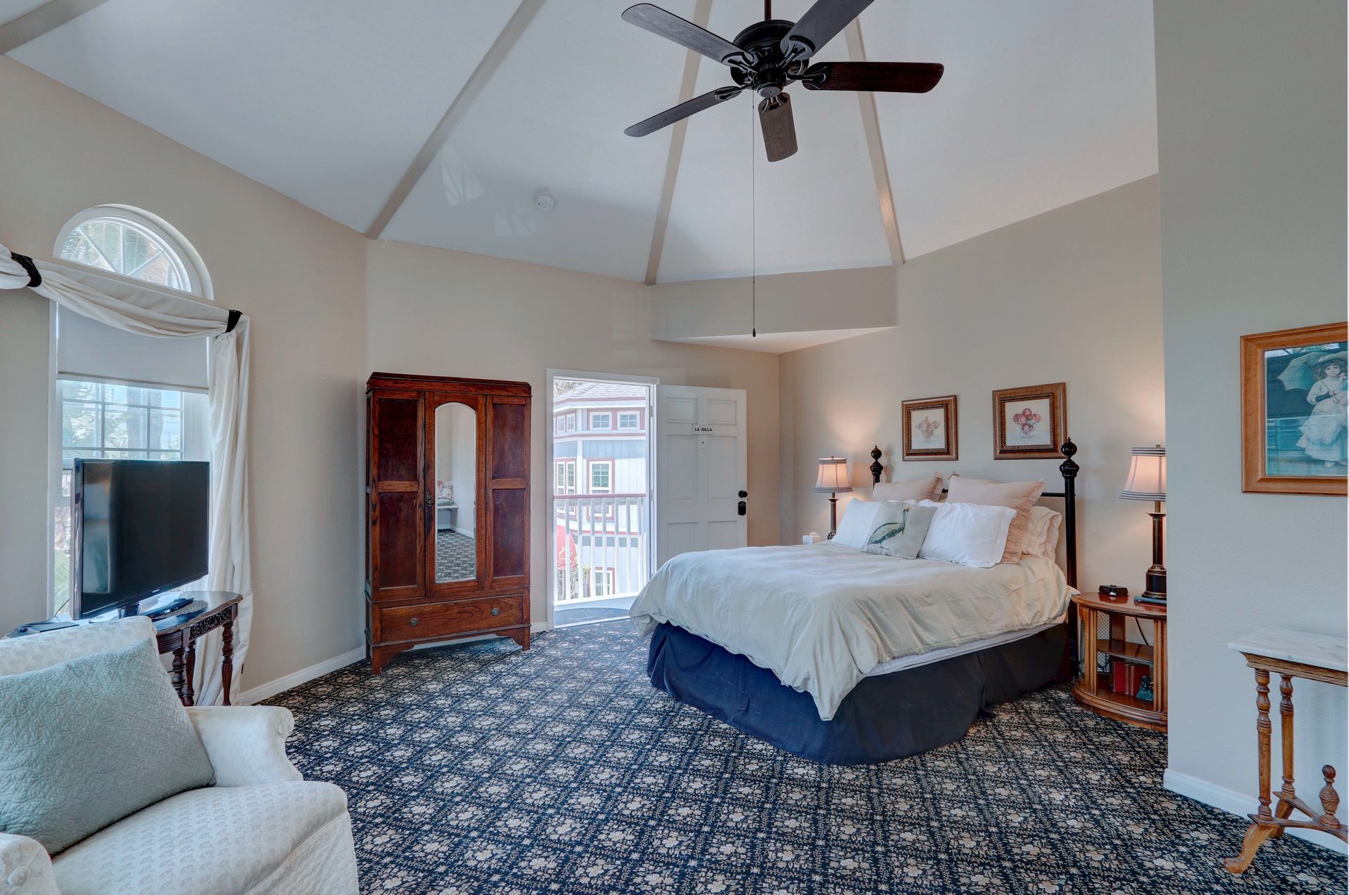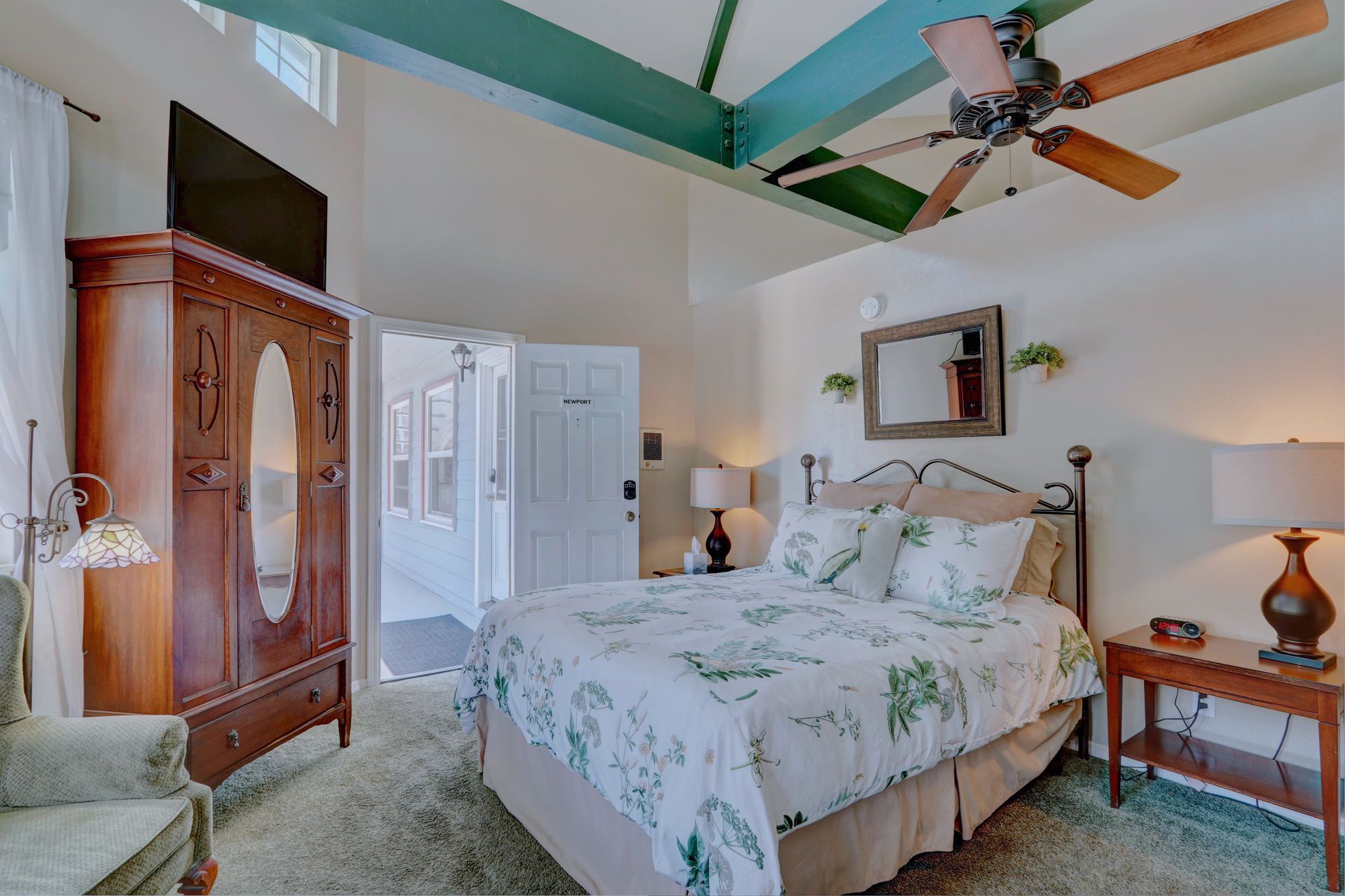 Vaulted ceilings and emerald decor give the Newport room an airy and inviting atmosphere. This room offers a queen-sized bed and a black tile bath.