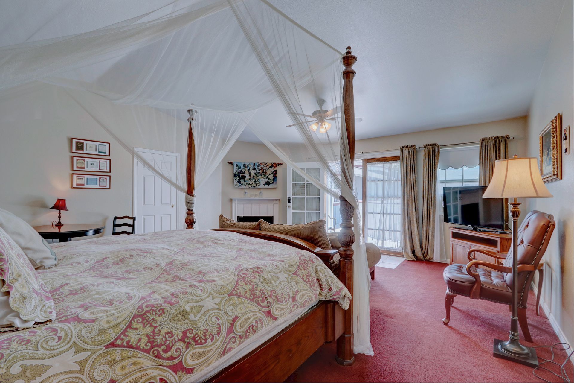 Pacific is the largest room we offer. A spacious room with a draped king-size 4 poster feather bed. A large spa tub with room for 2 makes this a very romantic room. This room can internally adjoin to the Santa Barbara room. Smart TV.